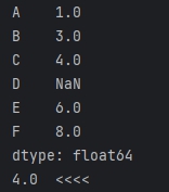 s = pd.Series([1, 3, 4, np.nan, 6, 8], index=['A','B','C','D','E','F'])